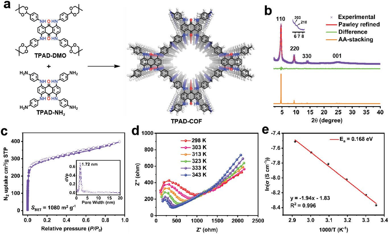 1) TPAD-COF的超亲水性和高质子导电性(室温下为2.32 × 10⁻⁴ S cm⁻¹)促进了质子传输。