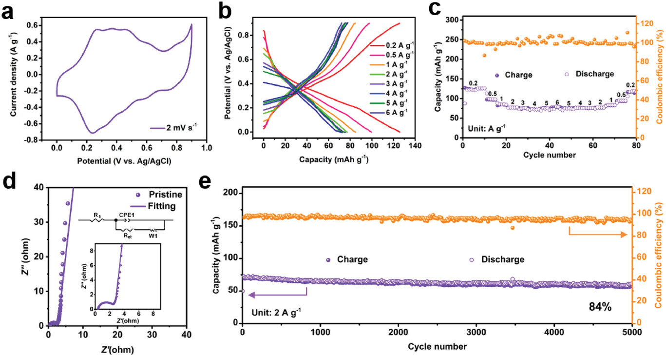 1) TPAD-COF在1.2 M H₂SO₄电解液中表现出优异的电化学性能:在0.2 A g⁻¹电流密度下容量为126 mAh g⁻¹,2 A g⁻¹电流密度下经过5000次循环后容量保持率为84%。