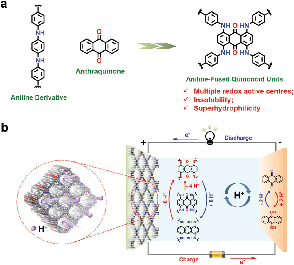 2.首次将苯胺融合醌基单元引入共价有机框架中,实现了高效的质子存储。