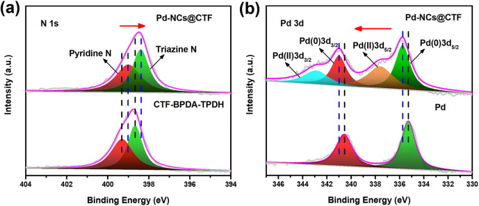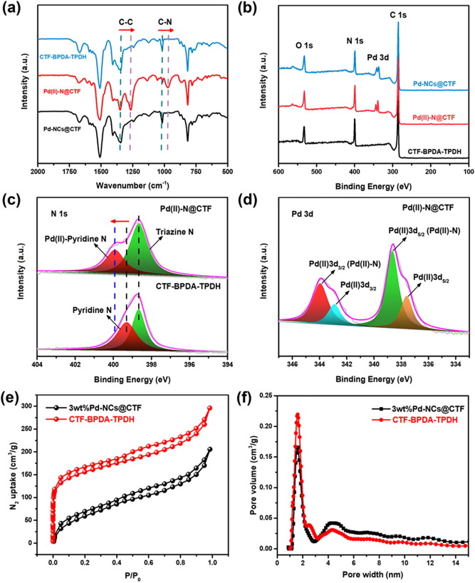 XPS/FTIR:证实 Pd-N 配位结构形成,还原后 Pd 以零价态存在,CTF 氮位点调控 Pd 电子结构(正电荷转移)。