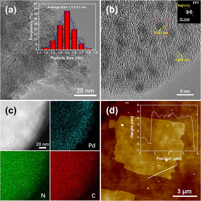TEM/AFM:CTF 为 2D 纳米片结构,厚度 4.5 nm,Pd NCs 均匀分散,平均粒径 1.5 ± 0.1 nm,与 CTF 孔径匹配。