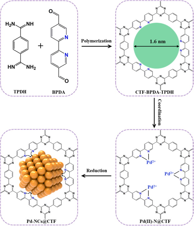 通过溶液浸渍 - 氢气还原法,在 CTF 孔道内原位生成 Pd NCs(负载量 1-4 wt%),形成 Pd-NCs@CTF 复合材料。