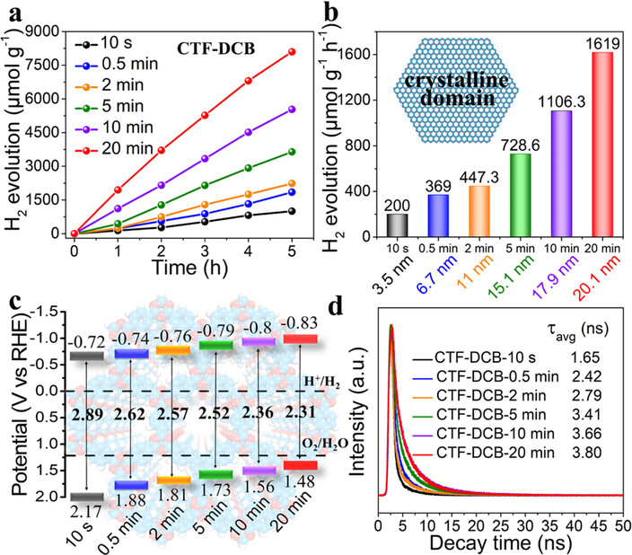 1) 光催化性能测试表明,结晶域较大的CTF-DCB展现出更高的光催化产氢速率。通过控制反应时间制备出具有不同结晶域的CTF-DCB,并将其用作光催化制氢的光催化剂,发现结晶域较大的CTF-DCB具有更高的光催化产氢速率。