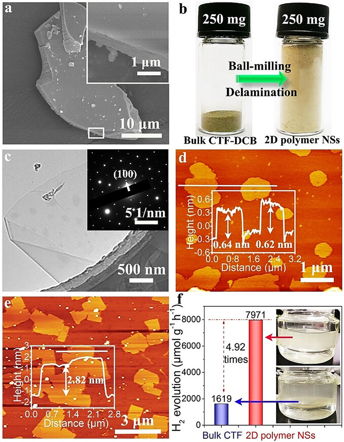 2) 通过球磨剥离法制备的单层和少层结晶二维三嗪聚合物纳米片的光催化产氢速率高达7971 mmol·g⁻¹·h⁻¹,比块状CTF-DCB提高了近五倍。