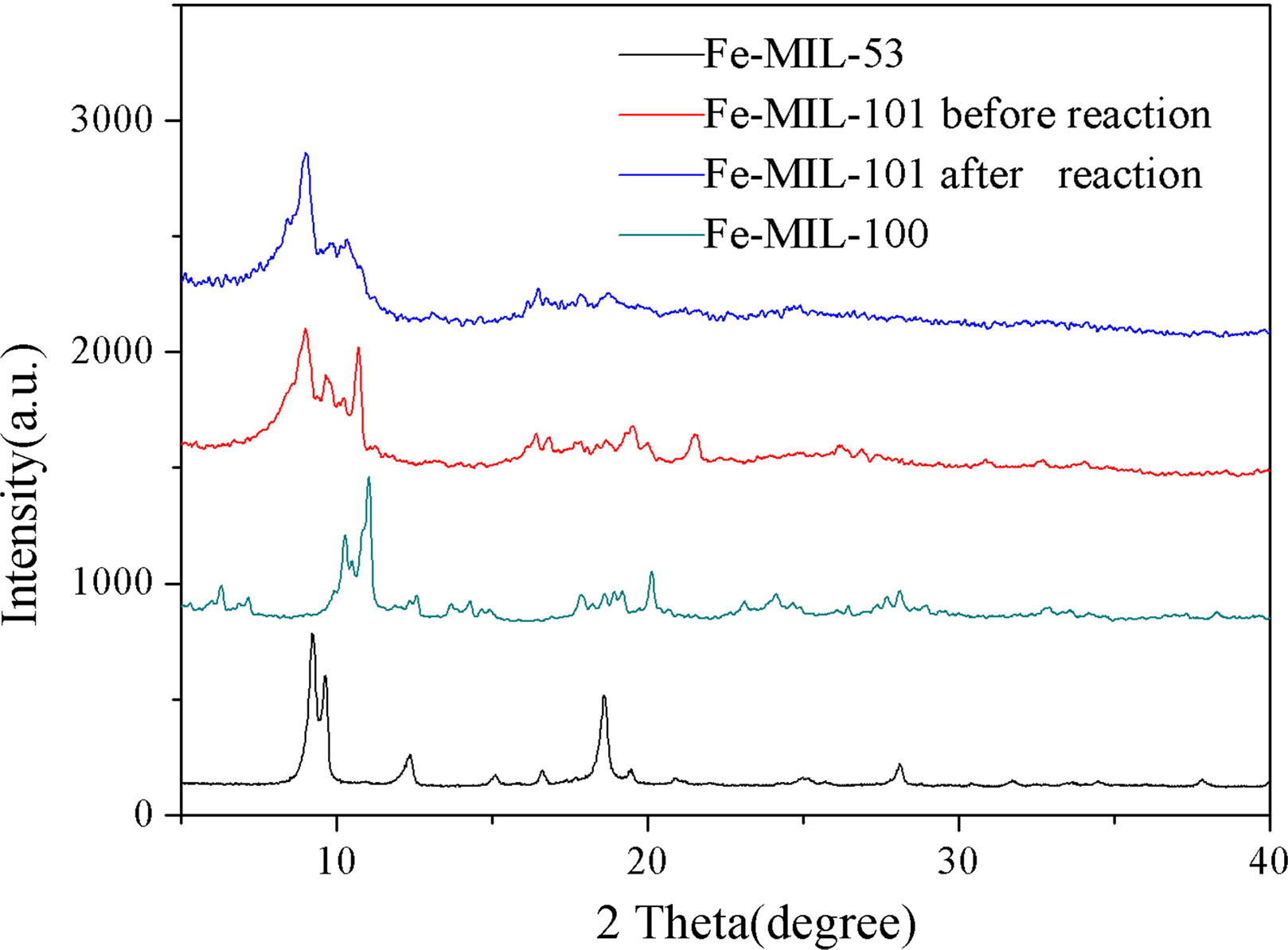 - 通过水热法制备了Fe-MIL-101、Fe-MIL-100和Fe-MIL-53。利用X射线衍射(XRD)、扫描电子显微镜(SEM)、傅里叶变换红外光谱(FTIR)、紫外-可见吸收光谱(UV-vis)和X射线光电子能谱(XPS)等技术对合成的MOFs进行了表征。