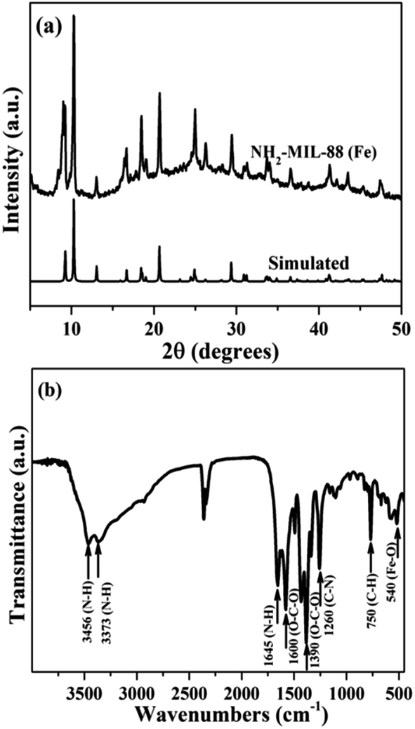 1.结构与形貌:XRD证实与NH₂-MIL-88(Fe)标准谱匹配;SEM/TEM显示纳米八面体(150nm),元素分布均匀;BET比表面积201m²/g,孔径1.4nm,孔容0.273cm³/g。