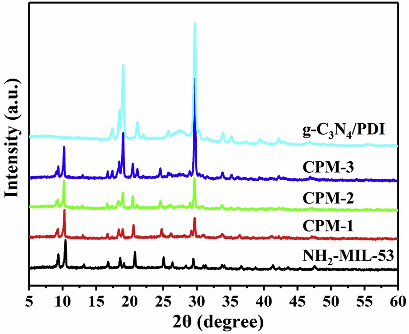 XRD:CPM复合材料保留NH₂-MIL-53(Fe)晶体结构,新增特征峰表明形成异质结。