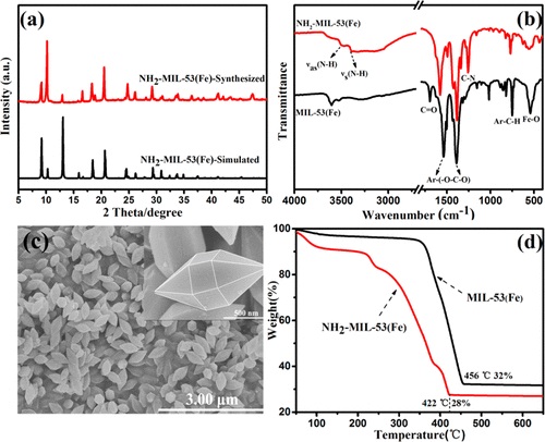 2. FT-IR:NH₂-MIL-53(Fe)在3491、3383cm⁻¹处有N-H峰,1255cm⁻¹处有C-N峰,证实氨基存在;反应后氨基信号减弱。