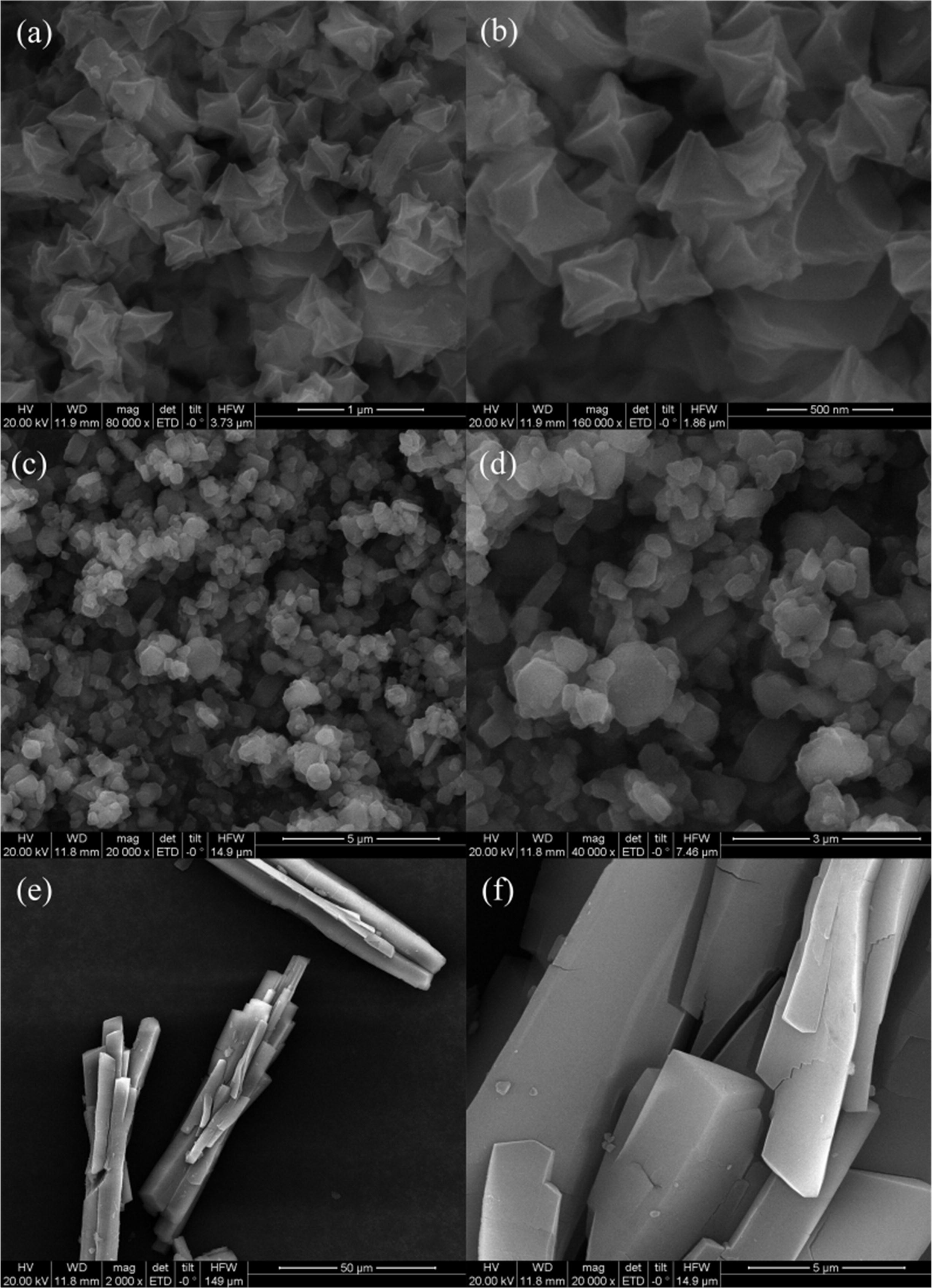 1.结构表征:XRD证实三种Fe-MILs晶相纯净;SEM显示Fe-MIL-101为规则八面体(约500nm),Fe-MIL-100为颗粒聚集(500nm-1μm),Fe-MIL-53呈棒状束(直径约80μm);XPS表明Fe-MIL-101含Fe、C、O元素,Fe以Fe³⁺形式存在。