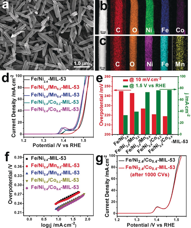 2.电催化性能测试:三电极体系在1.0M KOH中测试。工作电极为涂覆催化剂的玻碳电极或MOFs/NF。结果:Fe/Ni₂.₄/Co₀.₄-MIL-53在10mA·cm⁻²过电位219mV,20mA·cm⁻²过电位236mV,塔菲尔斜率53.5mV·dec⁻¹;Fe/Ni/Mn₀.₄-MIL-53/NF在100mA·cm⁻²过电位238mV,500mA·cm⁻²过电位290mV,60h测试电流密度衰减6.7%。