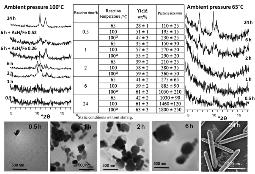 1.溶剂热合成:1mmol FeCl₃·6H₂O与1mmol富马酸溶于5mL溶剂(DMF、甲醇、水等),加或不加0.4mL 2M NaOH,置于高压釜100℃反应2-24小时,离心收集产物。结果显示,DMF中加NaOH时2小时可得255±25nm颗粒,产率38.6±2.0%;水中反应2小时得360±35nm颗粒,产率59.9±2.1%。