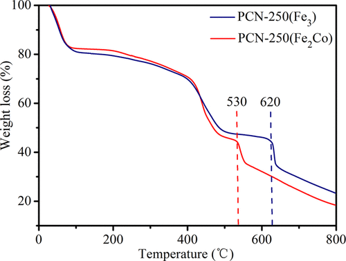 1. 结构表征:PXRD证实两种MOFs结构完整,Fe₂Co取代未破坏框架;BET表面积分别为1470、1653 m²/g,微孔体积0.506、0.573 cm³/g。