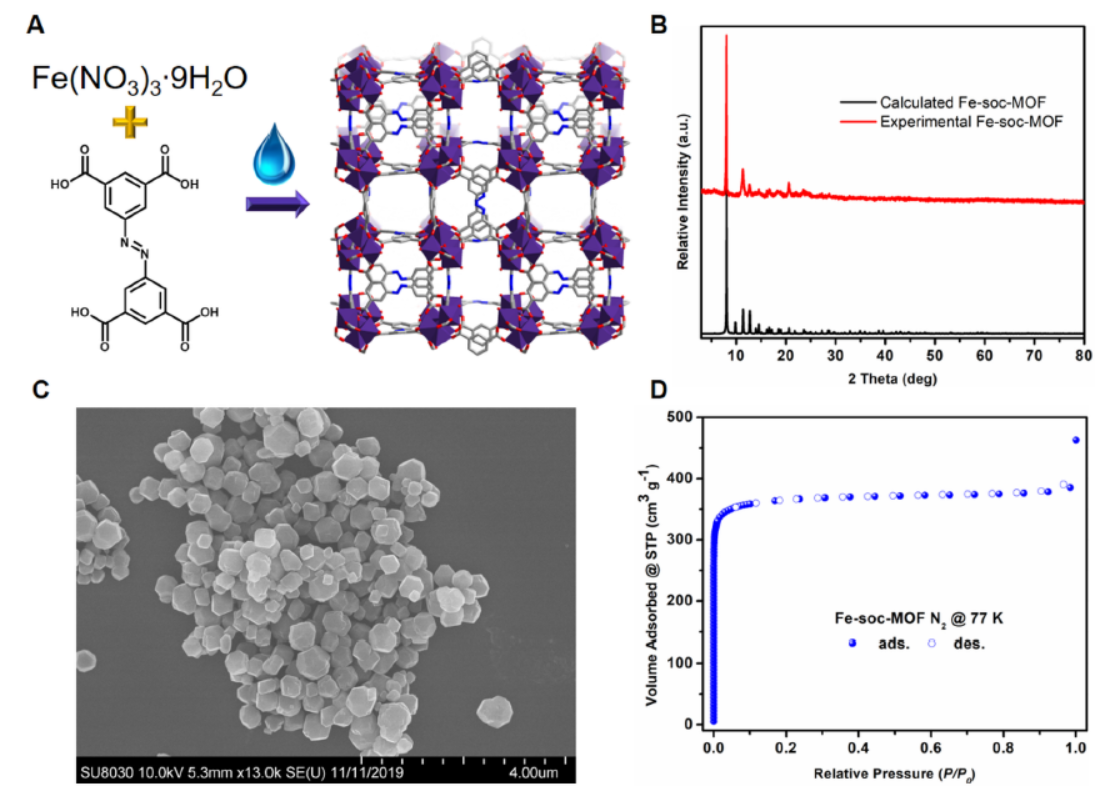 1. PXRD:实验合成的Fe-soc-MOF与计算的PXRD图谱一致,表明相纯。