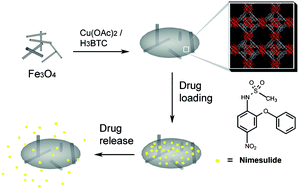 本文(J. Mater. Chem., 2011,21, 3843-3848) 提出一种简便、高效且环保的方法,制备新型磁性多孔金属有机框架(MOF)基纳米复合材料(Fe₃O₄/Cu₃(BTC)₂),将Fe₃O₄纳米棒与Cu₃(BTC)₂纳米晶结合,该材料兼具磁性与高孔隙率。负载抗癌药物尼美舒利(NIM)后,每克复合材料可吸附0.2g NIM,在37℃生理盐水中11天完成药物释放,有望用于靶向药物递送。
