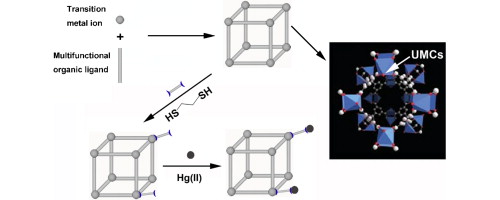 金属有机框架(MOFs)中的配位不饱和金属中心(UMCs)为通过配位键选择性功能化MOFs提供途径。本文以HKUST-1([Cu₃(BTC)₂(H₂O)₃]ₙ)为对象,采用简便配位后合成策略实现硫醇功能化,制备出一系列硫醇修饰的[Cu₃(BTC)₂]ₙ样品。该功能化材料对水中Hg²⁺吸附表现出高吸附亲和力(Kd=4.73×10⁵ mL/g)和高吸附容量(714.29 mg/g),而未功能化HKUST-1无Hg²⁺吸附能力。
