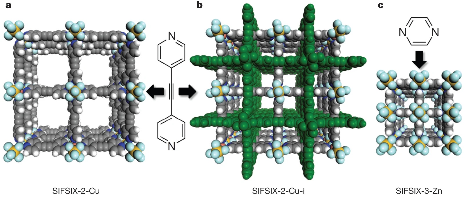 - 合成SIFSIX-3-Zn:甲醇中吡嗪与ZnSiF₆室温扩散3天得晶体。