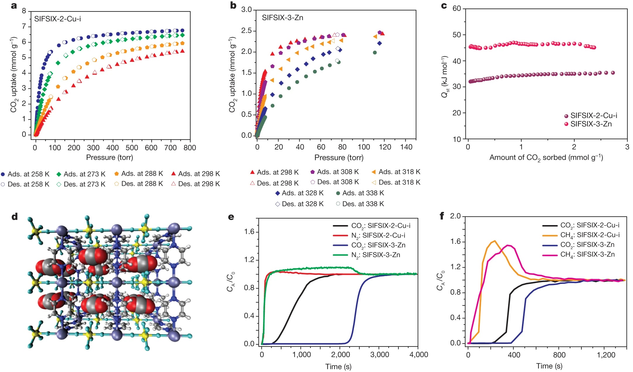 3. 吸附热与动力学分析:SIFSIX-3-Zn的CO₂吸附Qst约45kJ/mol,且在全负载范围内恒定;动力学研究显示CO₂吸附速率远快于N₂、CH₄等,混合气中CO₂占据所有吸附位点。