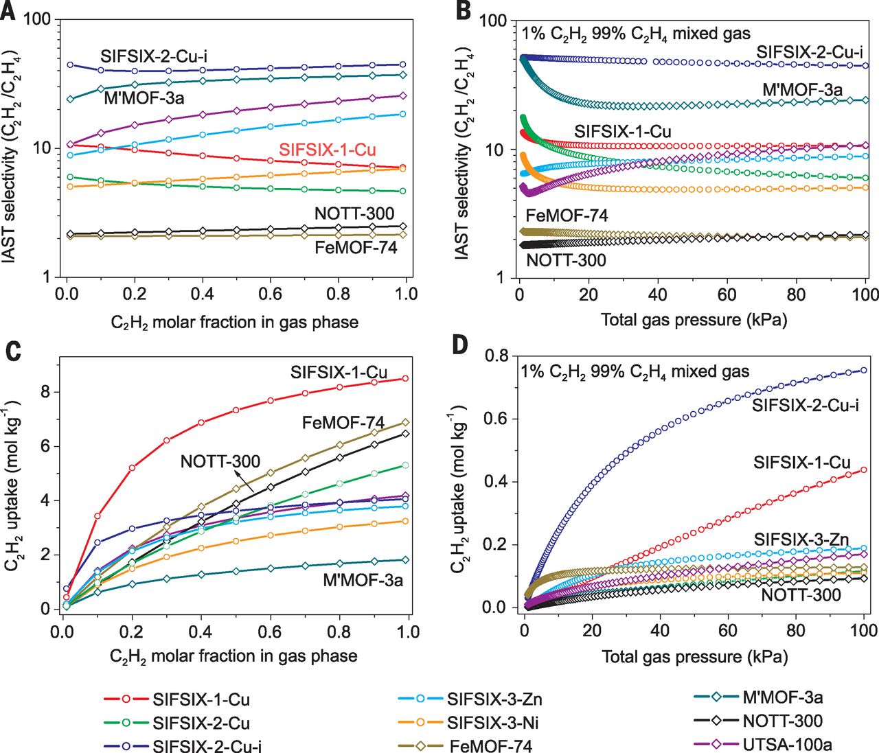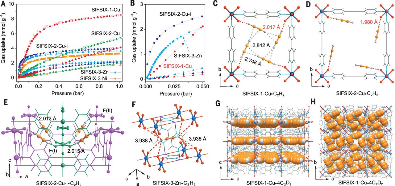 2.本文创新:利用SIFSIX系列金属配位网络,通过调控孔化学(SiF₆²⁻阴离子位点)与尺寸,实现乙炔特异性结合与高容量吸附,解决容量与选择性权衡问题。