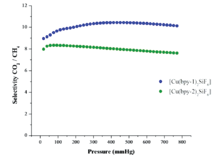 本文(J. Am. Chem. Soc. 2012, 134, 8)研究了多孔配位聚合物[Cu(bpy-n)₂(SiF₆)](bpy-1=4,4'-联吡啶;bpy-2=1,2-双(4-吡啶基)乙烯)对CO₂、CH₄、N₂和H₂O的选择性。气体吸附测试显示,298K、1atm下,[Cu(bpy-1)₂(SiF₆)]的CO₂吸附量为23.1wt%,是无开放金属位点PCP中最高值,CO₂/CH₄选择性约10.5:1;[Cu(bpy-2)₂(SiF₆)]孔径和比表面积更大,CO₂/CH₄选择性仍达约8:1。