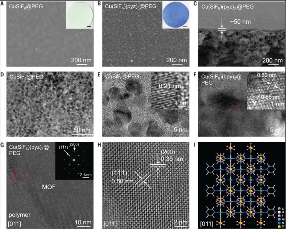 1.结构表征:XRD显示CuSiF₆@PEG前驱体经处理后完全转化为Cu(SiF₆)(pyz)₃(特征峰匹配模拟值);HRTEM观察到MOF晶格条纹(0.50nm对应(111)面、0.35nm对应(200)面),与[011]投影结构模型一致;EDX mapping证实Cu、F、C元素均匀分布。