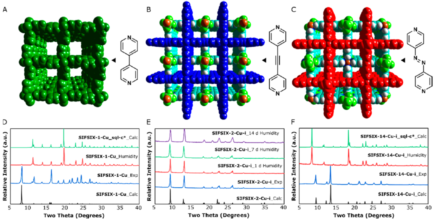2.本文创新:首次对四种含六氟硅酸盐(SIFSIX)阴离子的HUMs进行动态水蒸气吸附(DVS)研究,探究配位键和晶体堆积细微变化对水解稳定性及水蒸气吸附的影响,还研究新HUM(SIFSIX-14-Cu-i)的水蒸气吸附效应。