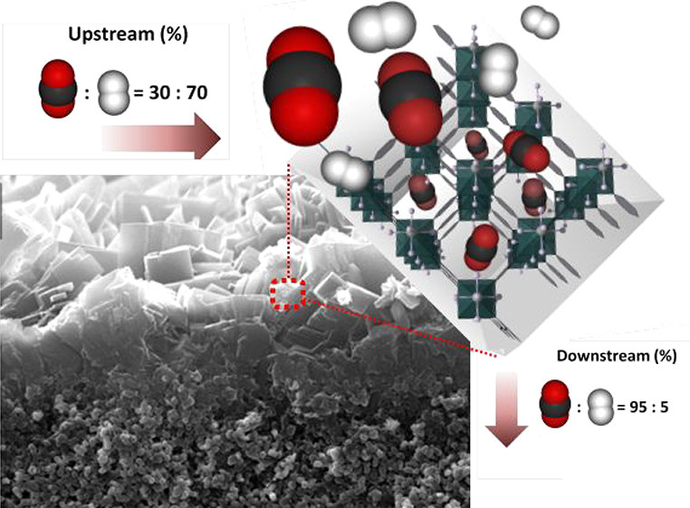 研究团队发现纳米多孔氟化金属有机框架(MOFs)SIFSIX-3-M(M=Zn、Cu、Ni)是优异的CO₂选择性吸附剂,其一维通道中氟基团周期性排列,对CO₂吸附选择性高。团队首次采用液相外延(LPE)法,在多孔氧化铝基底上成功制备出连续、均匀且无缺陷的SIFSIX-3-M(M=Ni或Cu)纯MOF膜。单气体和混合气体渗透测试表明,该膜具有CO₂选择性,对H₂和CH₄的CO₂选择性源于其功能性收缩通道中CO₂选择性吸附。