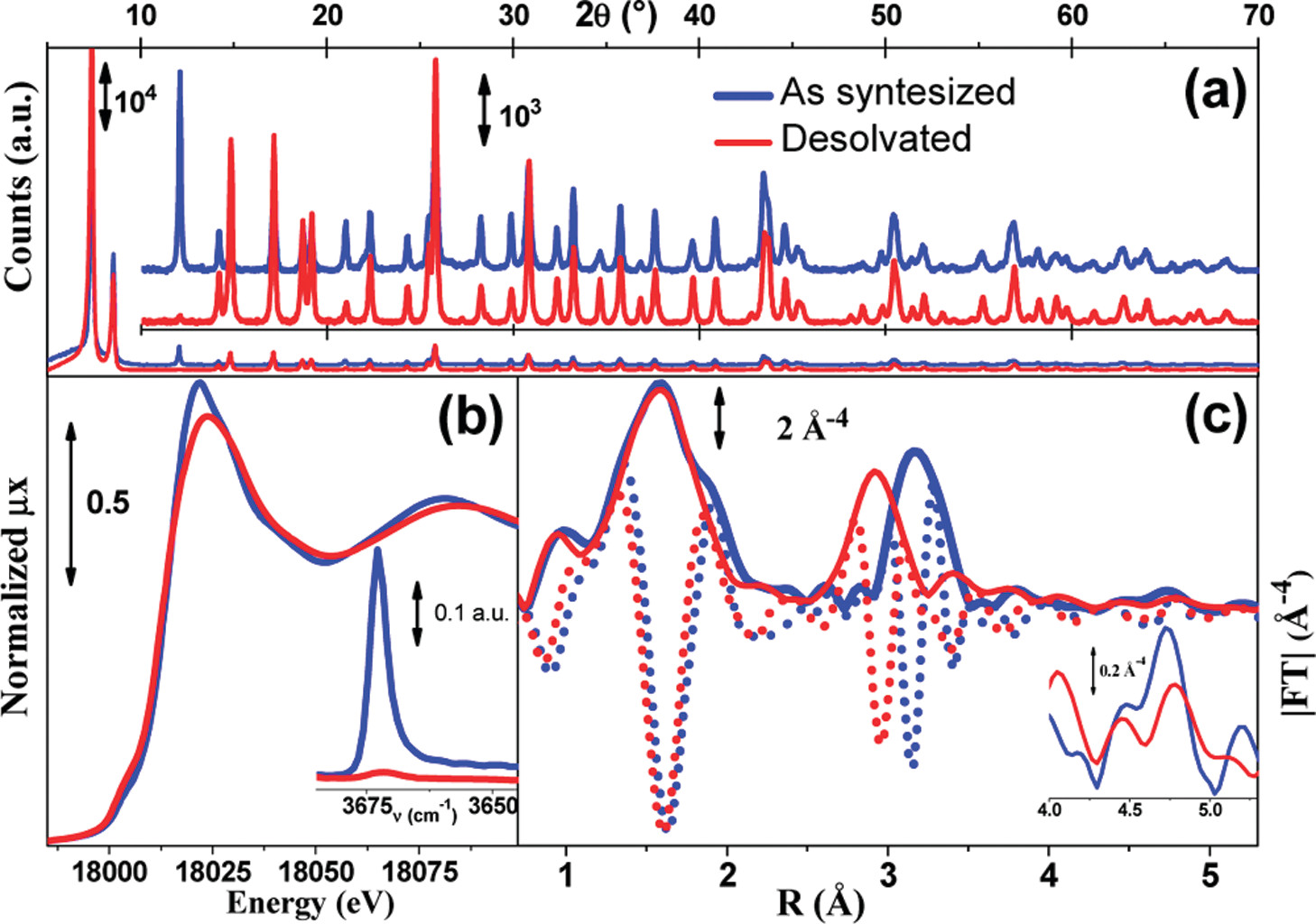 3.结构精修实验:用TOPAS软件精修XRPD数据,Athena/Arthemis处理EXAFS数据,CRYSTAL软件做DFT计算;结果:确定羟基化(Fm-3m)与去羟基化(R-3)空间群,获原子坐标、键长等参数。