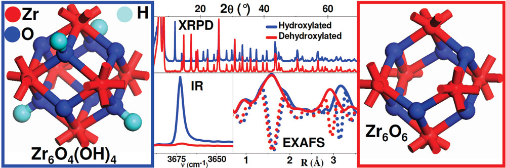 2.EXAFS分析:羟基化Zr配位数8,Zr-μ₃-O键长2.087Å、Zr-O1键长2.235Å;去羟基化后配位数7,Zr-μ₃-O键长2.06Å,Zr-Zr键分裂为3.35Å(8/3配位)和3.74Å(4/3配位),揭示Zr₆簇畸变。