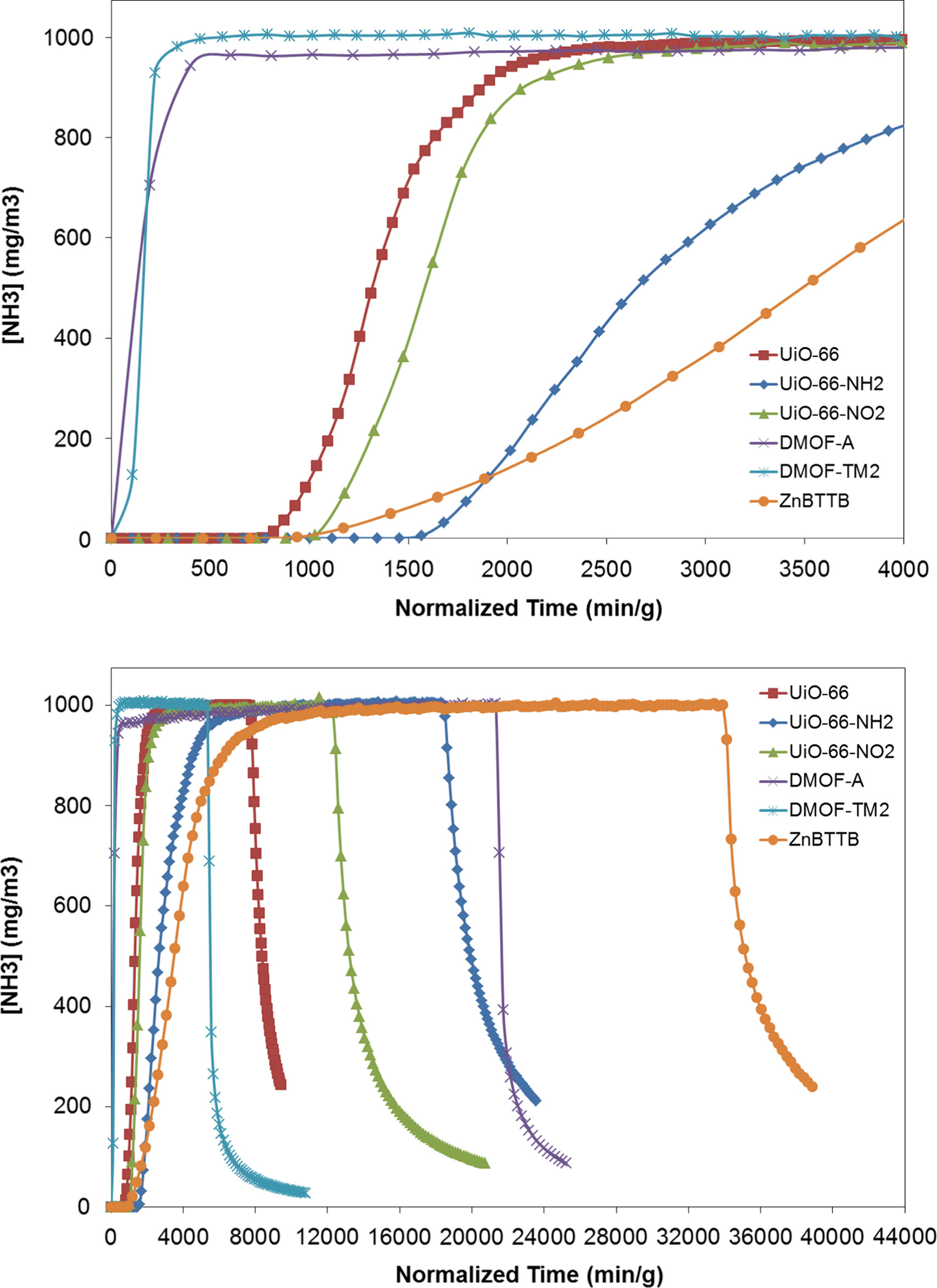 2.氨穿透实验:用微穿透系统,在20℃、干湿(80% RH)条件下,氨浓度1000或2000 mg/m³,流速20 mL/min,将吸附剂装于玻璃管,用气相色谱监测流出浓度,积分穿透曲线得氨容量,干态下UiO-66-OH氨容量约5.7 mmol/g。