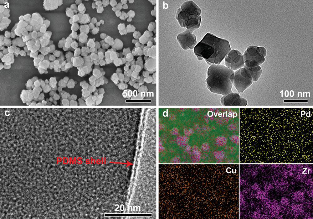 1.催化剂制备:①UiO-S制备:DMF中混合H₂BDC、2-磺基对苯二甲酸单钠盐与ZrCl₄,加乙酸,120℃反应24h,经酸化、洗涤、干燥得不同粒径UiO-S。②PdCu@UiO-S制备:UiO-S分散于正己烷,滴加K₂PdCl₄和CuCl₂·2H₂O水溶液,超声后干燥,在20% H₂/Ar中200℃还原4h,调整Cu比例得系列样品。③PdCu@UiO-S@PDMS制备:管式炉中,N₂氛围下230℃气相沉积PDMS于PdCu@UiO-S表面。