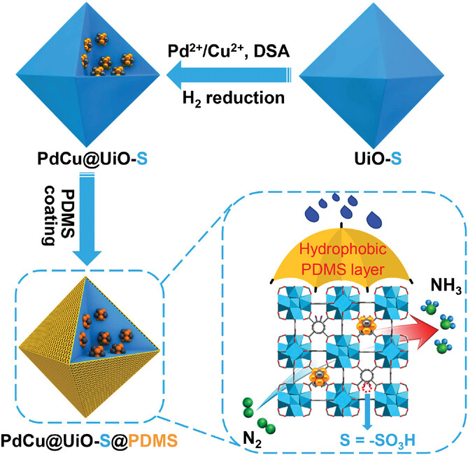 2.本文创新:将PdCu合金纳米颗粒封装于含磺酸基的UiO-S中,利用Cu调控Pd电子态,减弱Pd-H作用;再包覆PDMS,结合磺酸基的质子供给与PDMS的疏水特性,构建利于NRR的微环境。