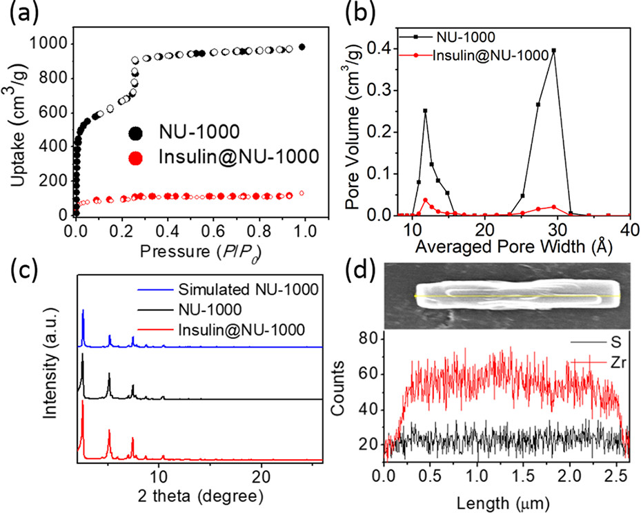 3.PXRD与SEM:PXRD证实包封后NU-1000结晶度保留;SEM-EDX显示Zr和S(胰岛素)在晶体中均匀分布,晶体尺寸无明显变化。