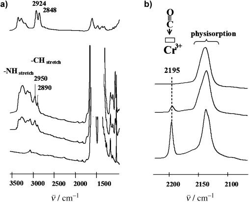 2.IR分析:ED-MIL-101在2800-3000cm⁻¹有CH伸缩振动且位移(图2a),CO吸附后CUSs特征峰减弱(图2b),ED-MIL-101(D)中CUSs消失,证明胺成功接枝。