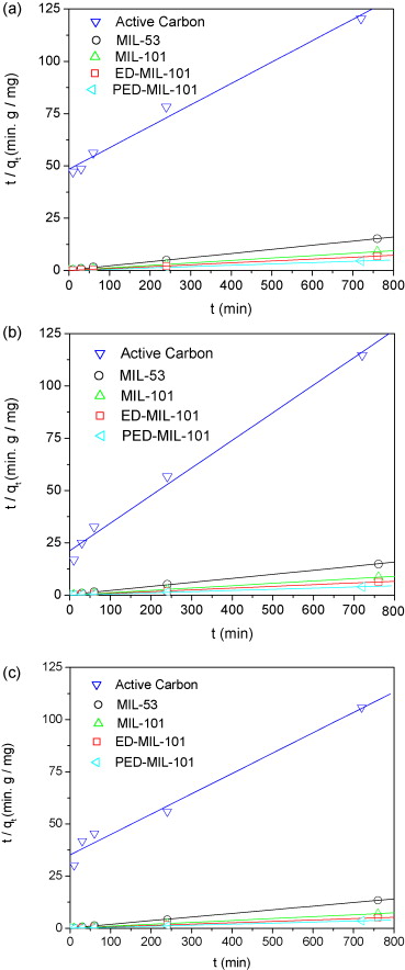 - 步骤:按文献方法制备MIL-53、MIL-101;依文献方法对MIL-101进行乙二胺接枝得ED-MIL-101;将ED-MIL-101用0.1M HCl溶液在室温下酸化6h得PED-MIL-101;购买颗粒度2-3mm的活性炭。