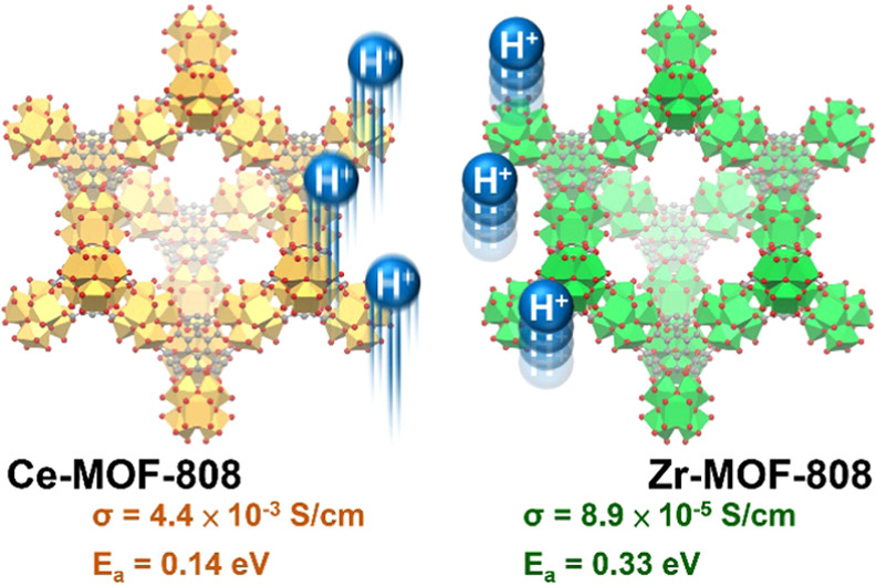 作者研究铈基金属有机框架(Ce-MOF-808)、锆基同构MOF及不同锆铈比双金属MOF的质子传导行为。用铈替代MOF-808节点中的锆,显著提升质子电导率(σ)并降低活化能(Eₐ)。Ce-MOF-808在25℃、99%相对湿度下σ达4.4×10⁻³ S/cm,Eₐ为0.14 eV(属质子传导MOF中最低水平)。密度泛函理论计算探究其质子亲和力,该研究首次报道铈基MOF的质子传导,表明铈基MOF比锆基MOF更适合设计质子导体,可用于能源相关领域。