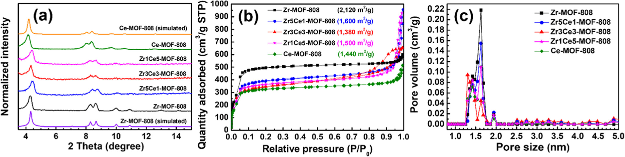 -结果:成功合成目标MOF,XRD证实结晶性,BET比表面积分别为Zr-MOF-808(2120m²/g)、Ce-MOF-808(1440m²/g)。