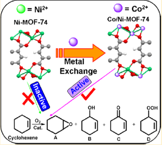 Mixed-Metal Strategy on Metal−Organic Frameworks (MOFs) for Functionalities Expansion: Co Substitution Induces Aerobic Oxidation of Cyclohexene over Inactive Ni-MOF-74