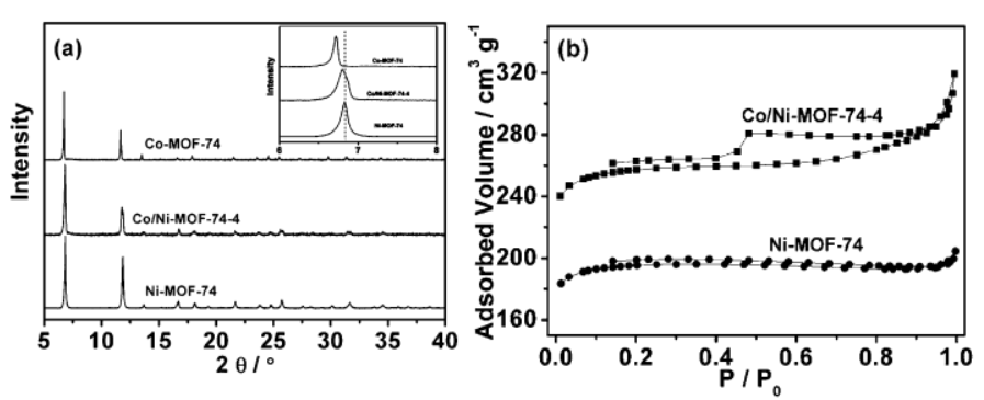 XRD:Ni-MOF-74 与 Co/Ni-MOF-74-4 衍射峰相似,证实框架保留;Ni-MOF-74 约 6.8° 的 2θ 峰在 Co 掺入后向低角度偏移,因 Co²⁺(0.745Å)大于 Ni²⁺(0.690Å)致晶格膨胀。