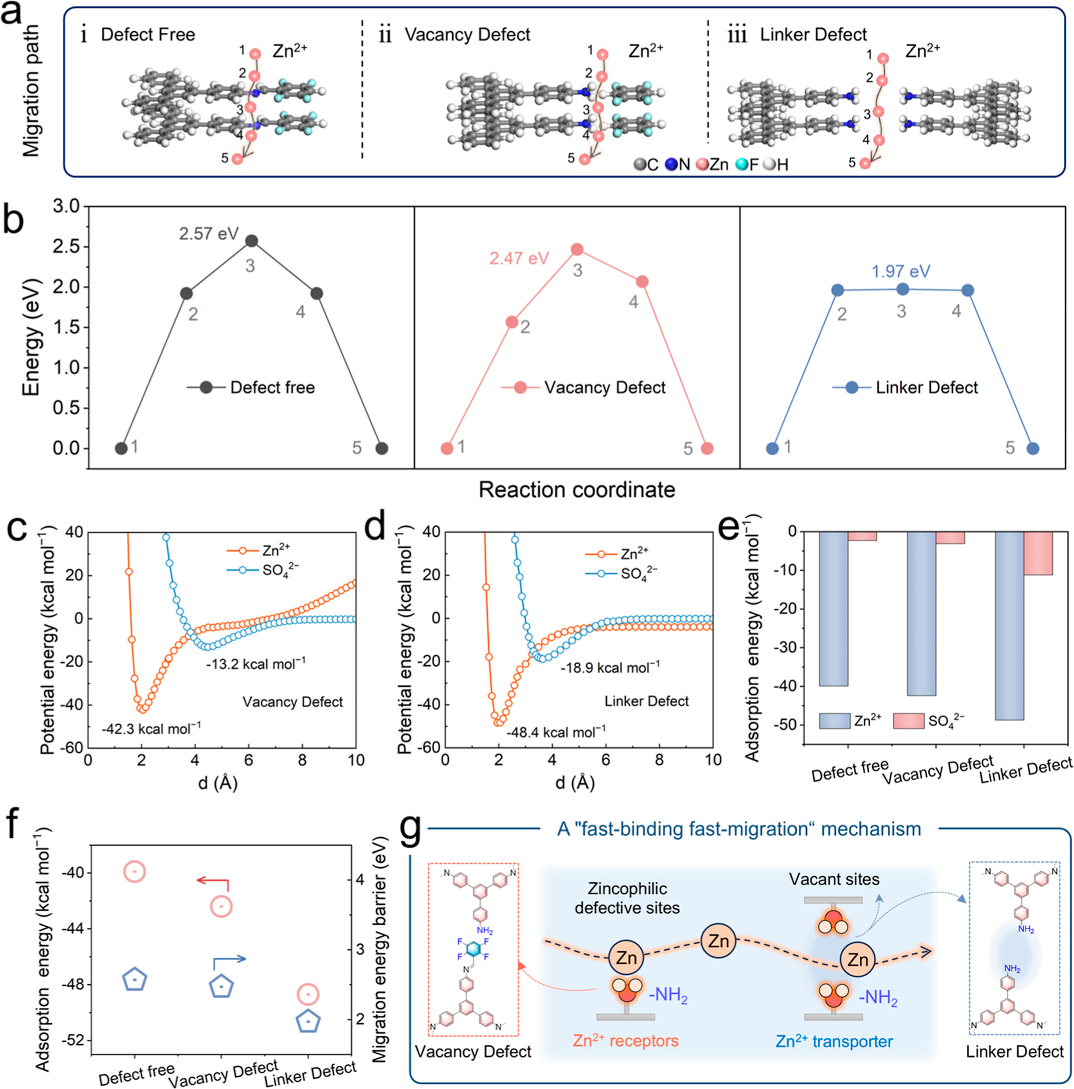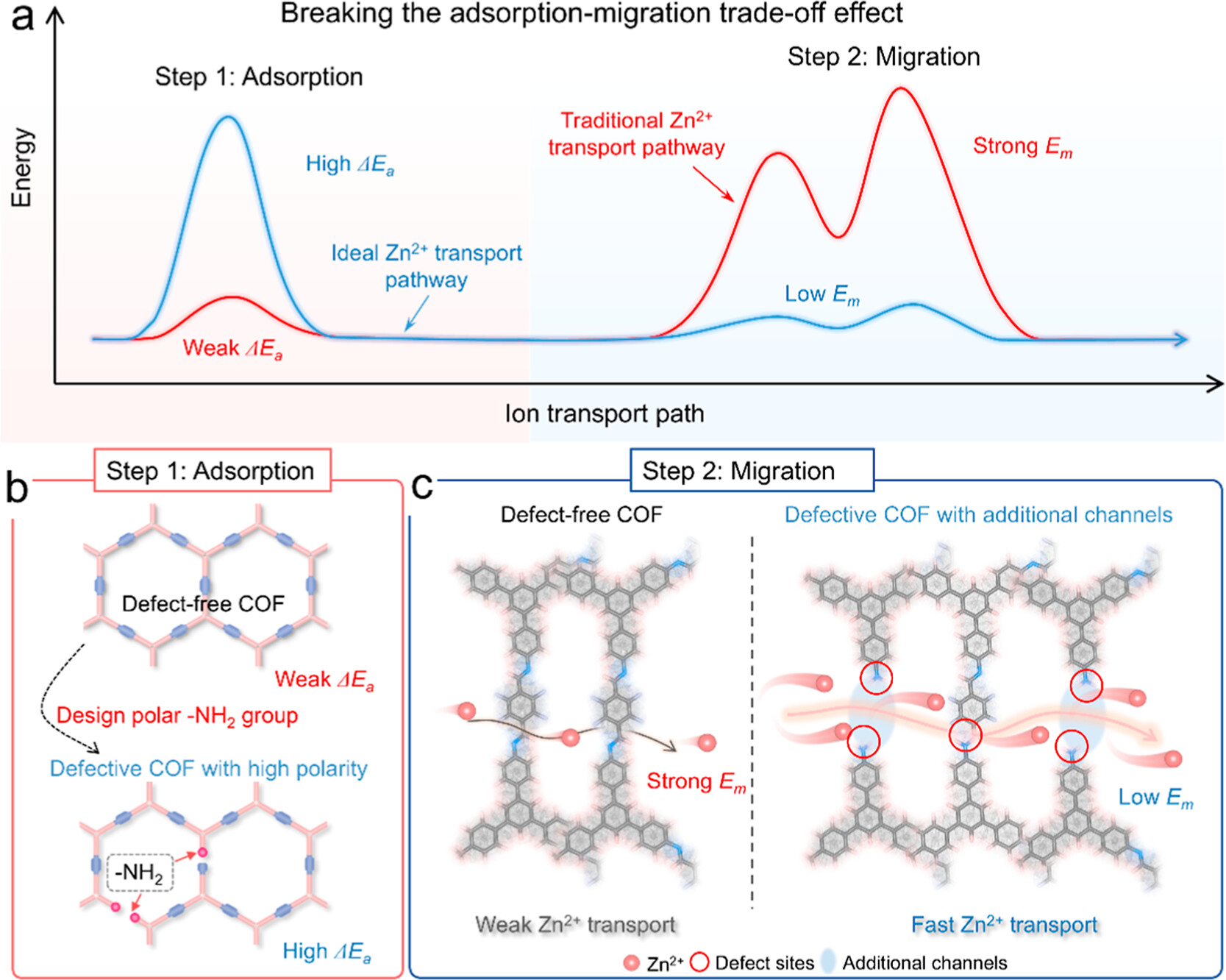 缺陷型FCOF中-NH₂极性基团通过强相互作用快速捕获Zn²⁺(FCOF-30吸附能-48.7 kcal/mol,无缺陷FCOF为-39.9 kcal/mol);同时,缺陷产生的空位与linker缺陷形成额外通道,降低Zn²⁺迁移能垒(FCOF-30 linker缺陷迁移能垒1.97 eV,无缺陷FCOF为2.57 eV),打破“吸附强则迁移难”的权衡效应。