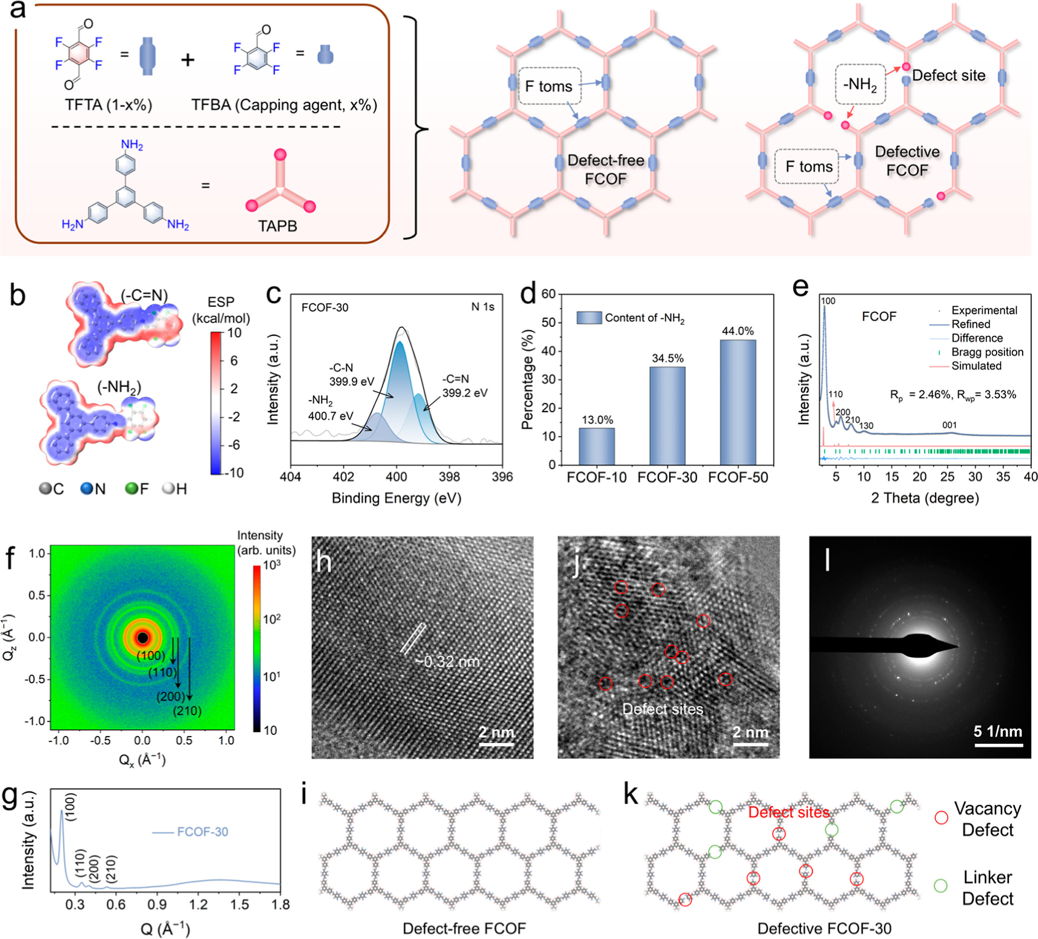-具体结果:FT-IR显示缺陷型FCOF在3100~3500 cm⁻¹有-NH₂峰,1620 cm⁻¹有-C=N峰;XPS定量FCOF-30中-NH₂占比34.5%;XRD证实FCOF-30保持结晶性(Rₚ=0.47%,R wp=0.56%),FCOF-50结晶度下降。
