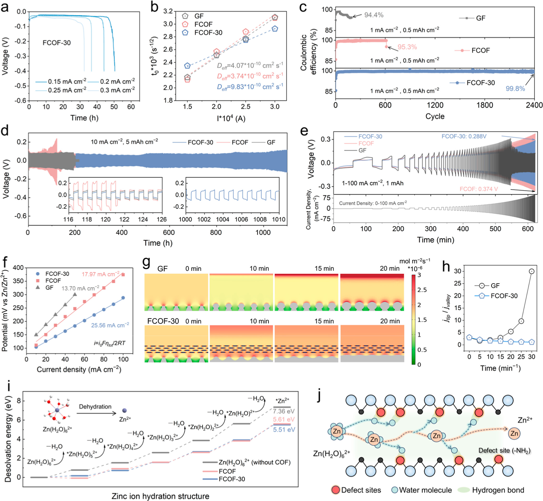 -NH₂与水分子形成氢键,促进水合Zn²⁺脱溶剂化(FCOF-30脱溶剂化能5.51 eV,无缺陷FCOF为5.61 eV),固定自由水以抑制HER;COF骨架中的氟原子与Zn形成弱配位作用,引导Zn²⁺均匀沉积,减少枝晶生长,Tafel测试证实FCOF-30腐蚀电流密度最低。