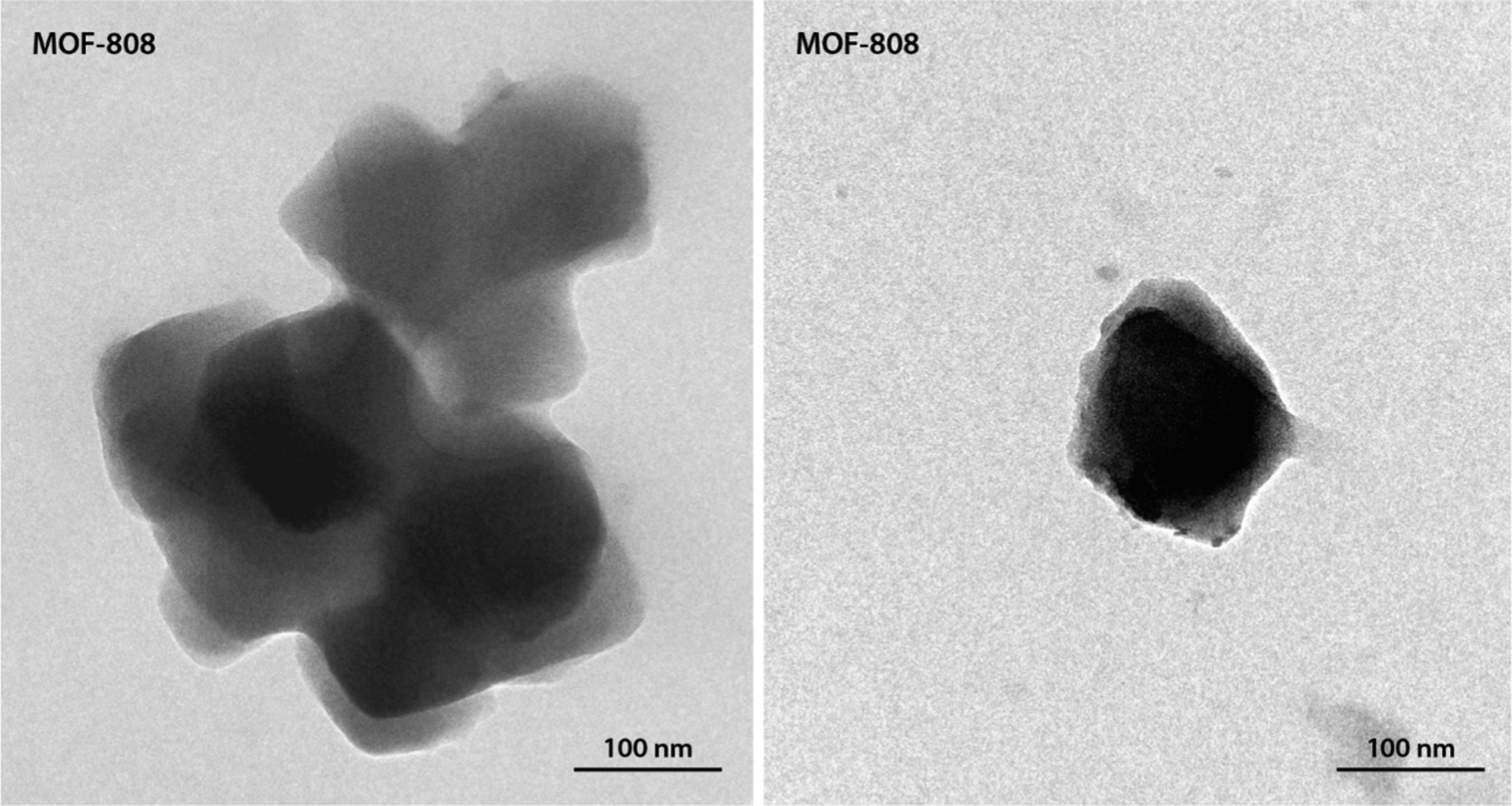 1.MOF-808合成:0.699g ZrCl₄与0.210g H₃BTC溶于45/45mL DMF/甲酸混合液,200mL烧瓶中400W微波照射30分钟,离心后DMF洗涤3次,70℃干燥12小时;部分样品分别用丙酮、水交换后100℃真空干燥。结果:得到白色八面体MOF-808晶体,平均直径200nm。