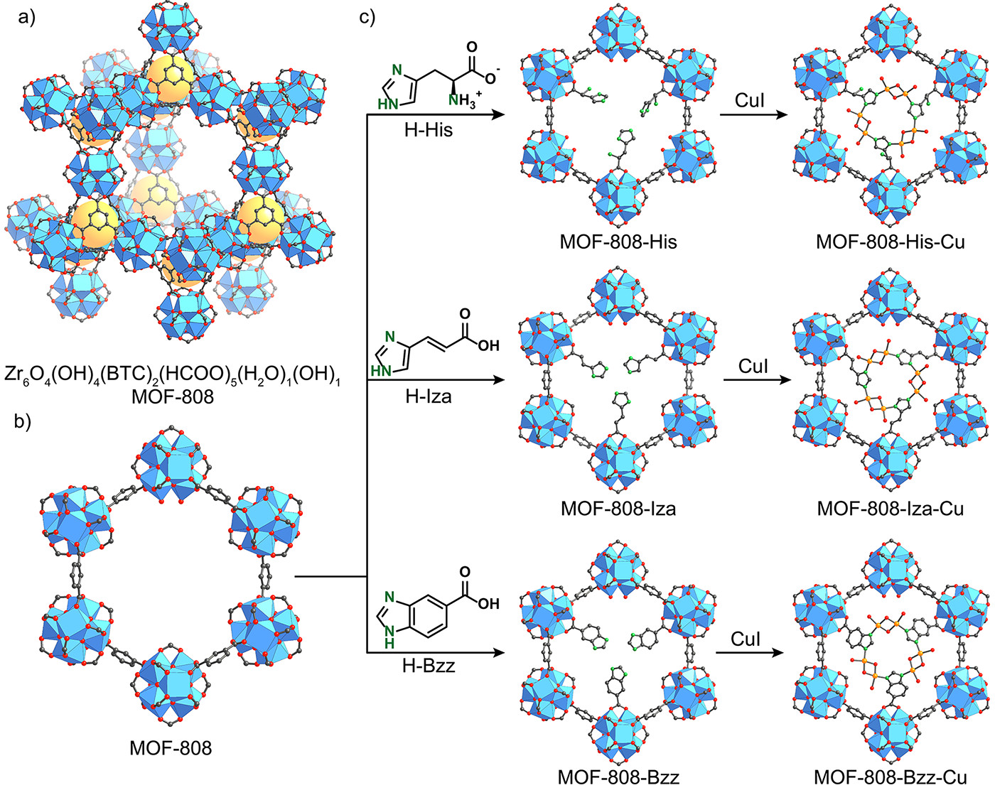 3.MOF-808-Bzz-Cu合成:CuI(81.6mg)溶于乙腈(12.8mL),加入MOF-808-Bzz(75mg)的乙腈(1.9mL)悬浮液,室温搅拌3天,离心收集棕色粉末,乙腈洗涤后真空干燥,ICP分析Cu/Zr摩尔比=1.2。