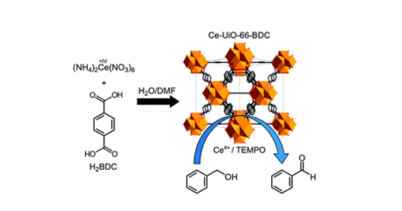 本文在温和条件、短反应时间下,合成出9种具有UiO-66结构的Ce(IV)基金属有机框架(MOFs),其含不同尺寸和功能的连接分子。测定了这些MOFs的热稳定性与化学稳定性,并成功将Ce-UiO-66-BDC/TEMPO体系用于苯甲醇的有氧氧化反应。
