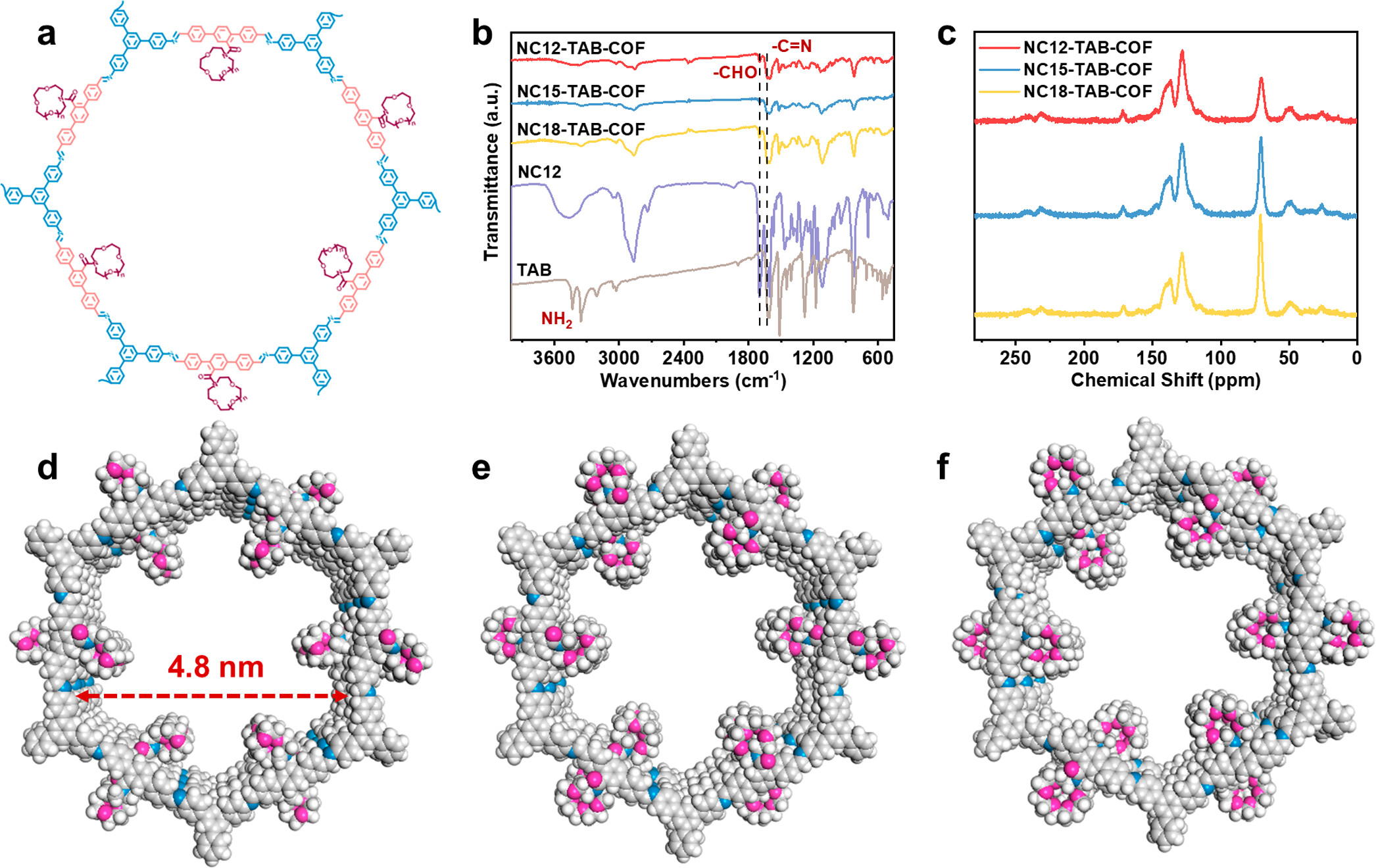 -COF合成 :将NCx-macTP-CHO₂与1,3,5-三(4-氨基苯基)苯(TAB)在1,2-二氯苯/正丁醇混合溶剂中,以Sc(OTf)₃为催化剂,130℃溶剂热反应,得到NC12-TAB-COF、NC15-TAB-COF、NC18-TAB-COF,优化后产率达80%。