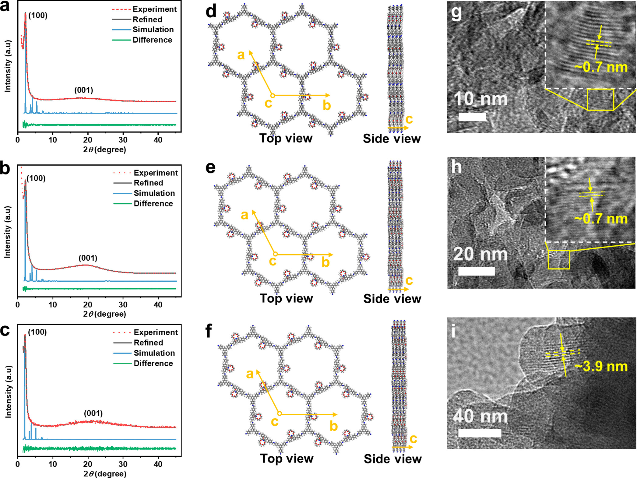 -晶型与结构 :X射线衍射(PXRD)表明三种COF均为AA堆叠的六方结构,特征衍射峰(100)和(001)与模拟图谱高度吻合,Pawley精修后可靠性因子低(Rp<3.3%,Rwp<4.3%),证明结晶度优异;高分辨透射电镜(HR-TEM)观察到层状多孔结构,与模拟的1D有序通道(孔径约3.7 nm)一致。