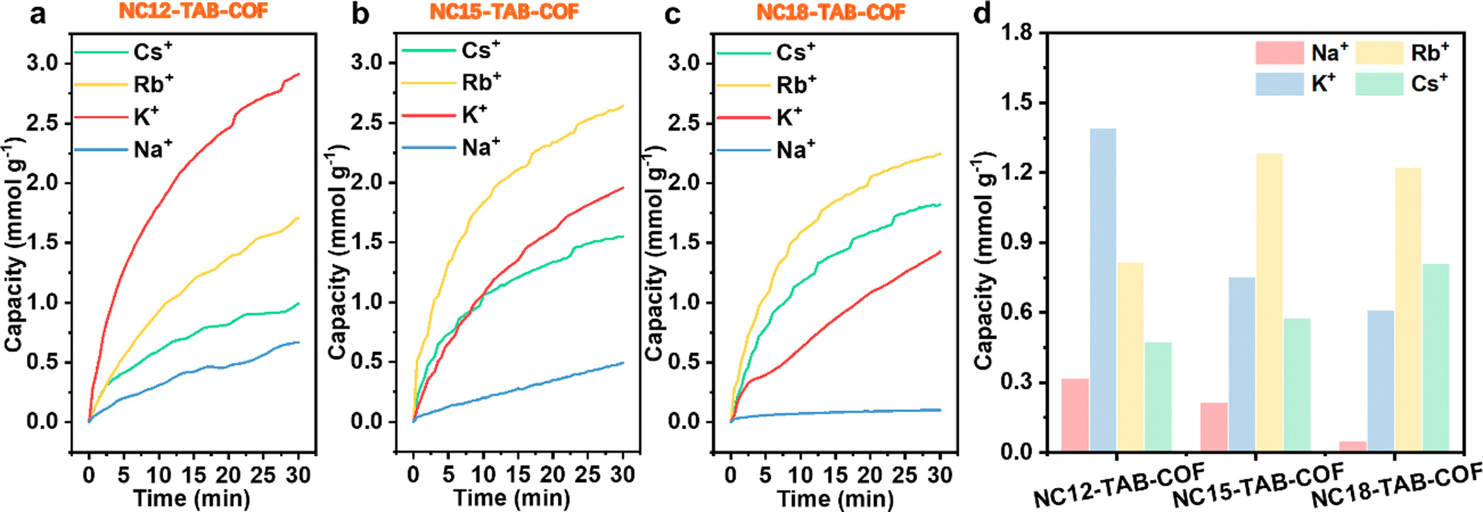 -单一阳离子体系中,NC12-TAB-COF对K⁺吸附容量最高(2.91 mmol/g),选择性顺序为K⁺>Rb⁺>Cs⁺>Na⁺;NC15-TAB-COF优先吸附Rb⁺(2.64 mmol/g);NC18-TAB-COF对Rb⁺吸附容量达2.24 mmol/g,且对K⁺/Na⁺、Rb⁺/Na⁺选择性最优。