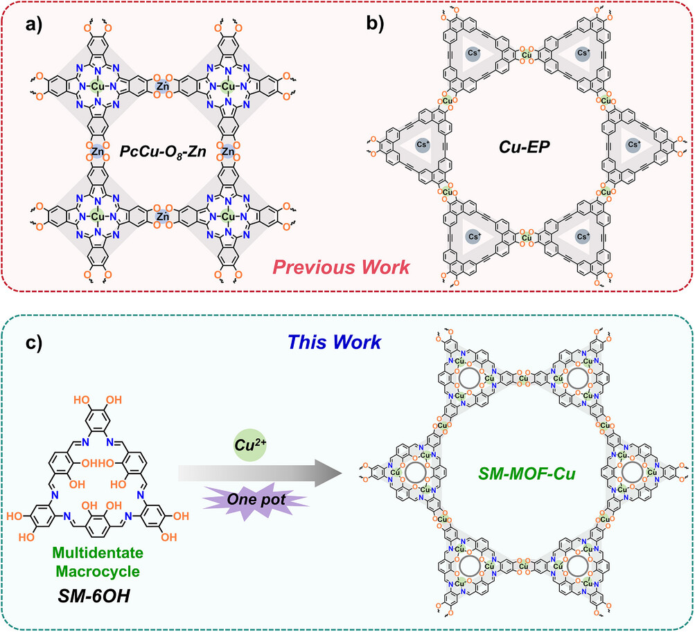 1) 现有大环基2D c-MOFs(如酞菁、卟啉基材料)多依赖单齿配位,活性位点密度低,且电子共轭性不足,限制了电催化反应中的电荷转移速率。