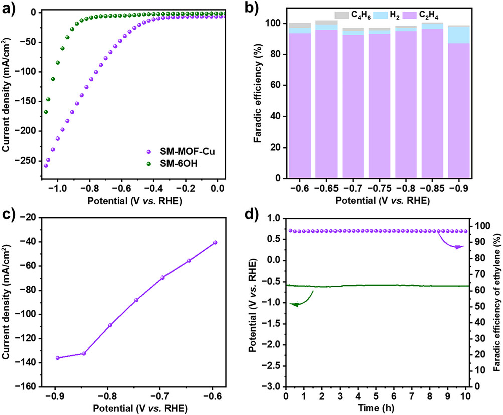 1) E-HAE性能:在1.0 M KOH电解液、纯乙炔气流下,LSV曲线显示SM-MOF-Cu在-1.0 V vs. RHE时电流密度显著高于SM-6OH配体;-0.85 V时乙烯FE达96.6%,副产物H₂ FE<3.1%,1,3-丁二烯FE<0.85%,性能优于多数已报道Cu基催化剂(如Cu-CuPc的乙烯FE仅11.0%)。