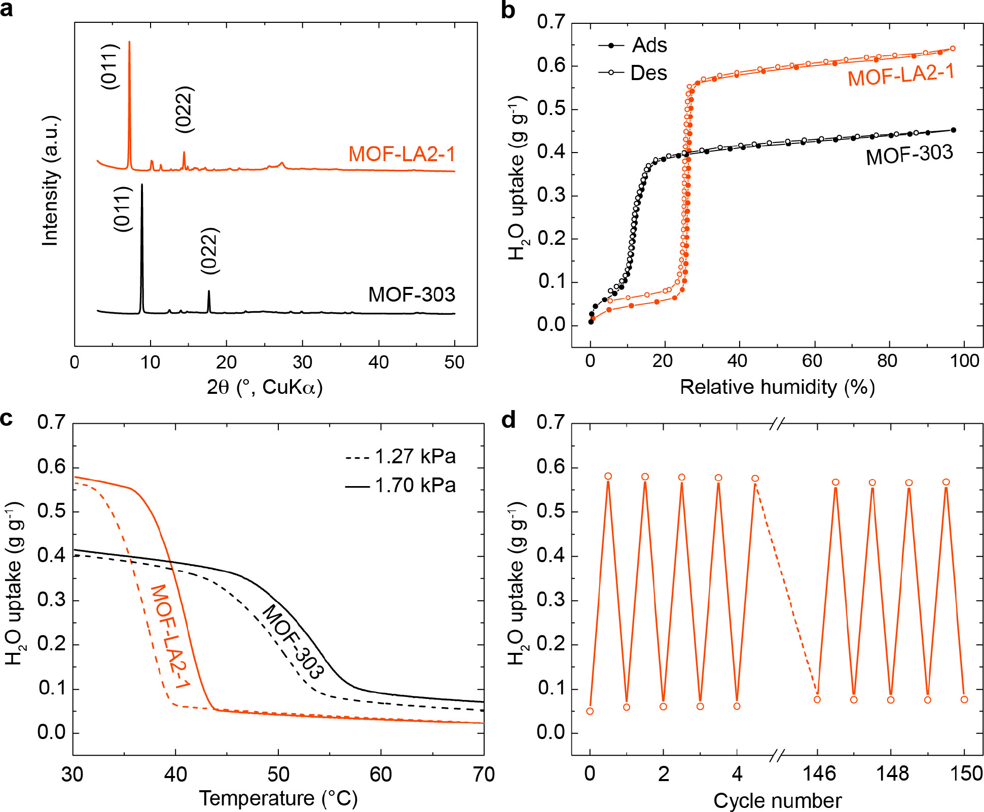 1.主要研究结果:合成MOF-LA2-1,水容量提高50%,再生温度低至45℃,循环稳定性好。